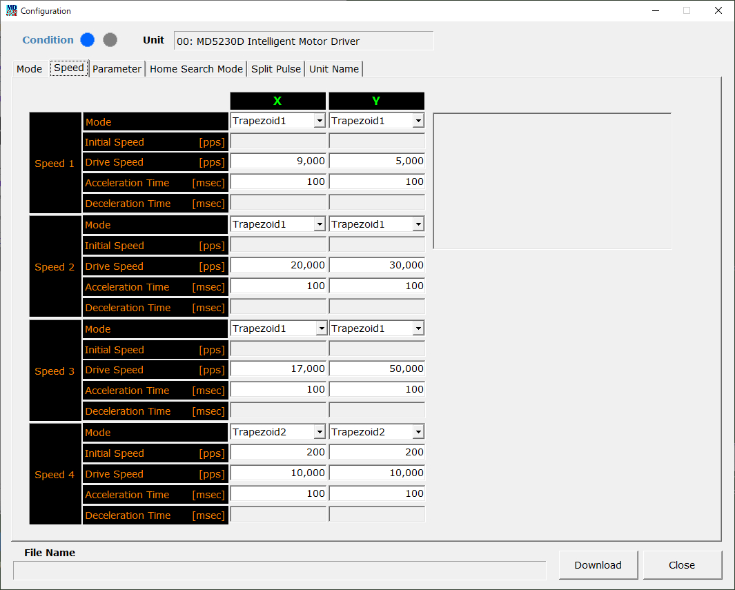Edit and save various settings (mode, speed, and others) with configuration setting window.
